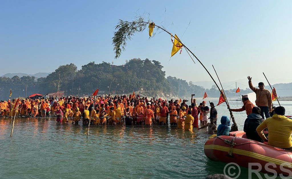 चितवन । पवित्र तीर्थस्थल देवघाटको बेनीमा आज बिहान बाँसको लिङ्गो गाडेर माघे सङ्क्रान्ति मेलाको शुभारम्भ गरिएको छ । गलेश्वर आश्रमका पीठाधीश अनन्त श्री विभूषित आत्मानन्द गिरी जी महाराज, हरिहर आश्रमका पिठाधीश १००८ स्वामी ज्ञानानन्द जी महाराज, महेश सन्यास आश्रमका पीठाधीश १००८ स्वामी रमणानन्द जी महाराजसहित सन्तमहन्त, बटुकलगायत स्थानीय व्यक्तिको उपस्थितिमा बाँसको लिङ्गो ठड्याइएको हो । यसअघि गलेश्वर आश्रममा भेला भएर विधिवत्रुपमा लिङ्गोसहित शोभायात्रा बेनीमा पुगेको थियो । सो अवसरमा देवघाट क्षेत्र विकास समितिका अध्यक्ष बद्री अधिकारी, सदस्य नवराज ढकाललगायतको उपस्थिति रहेको थियो ।
