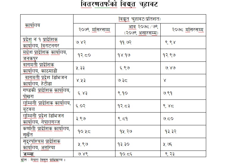 लुम्बिनी प्रदेश अन्तर्गत प्रदेश डिभिजन कार्यालय नेपालगञ्ज मातहतका ९ वटा वितरण केन्द्रहरुको गत वर्षको मंसिरसम्ममा ७.८० प्रतिशत रहेकोमा यस वर्ष ३.९७ प्रतिशत रहेको छ । कार्यालय अन्तर्गत सबैभन्दा बढी विद्युत चुहावट रोल्पा वितरण केन्द्रको १४.९० प्रतिशत रहेको छ । अघिल्लो वर्ष त्यस केन्द्रको चुहावट १९.२९ प्रतिशत थियो ।