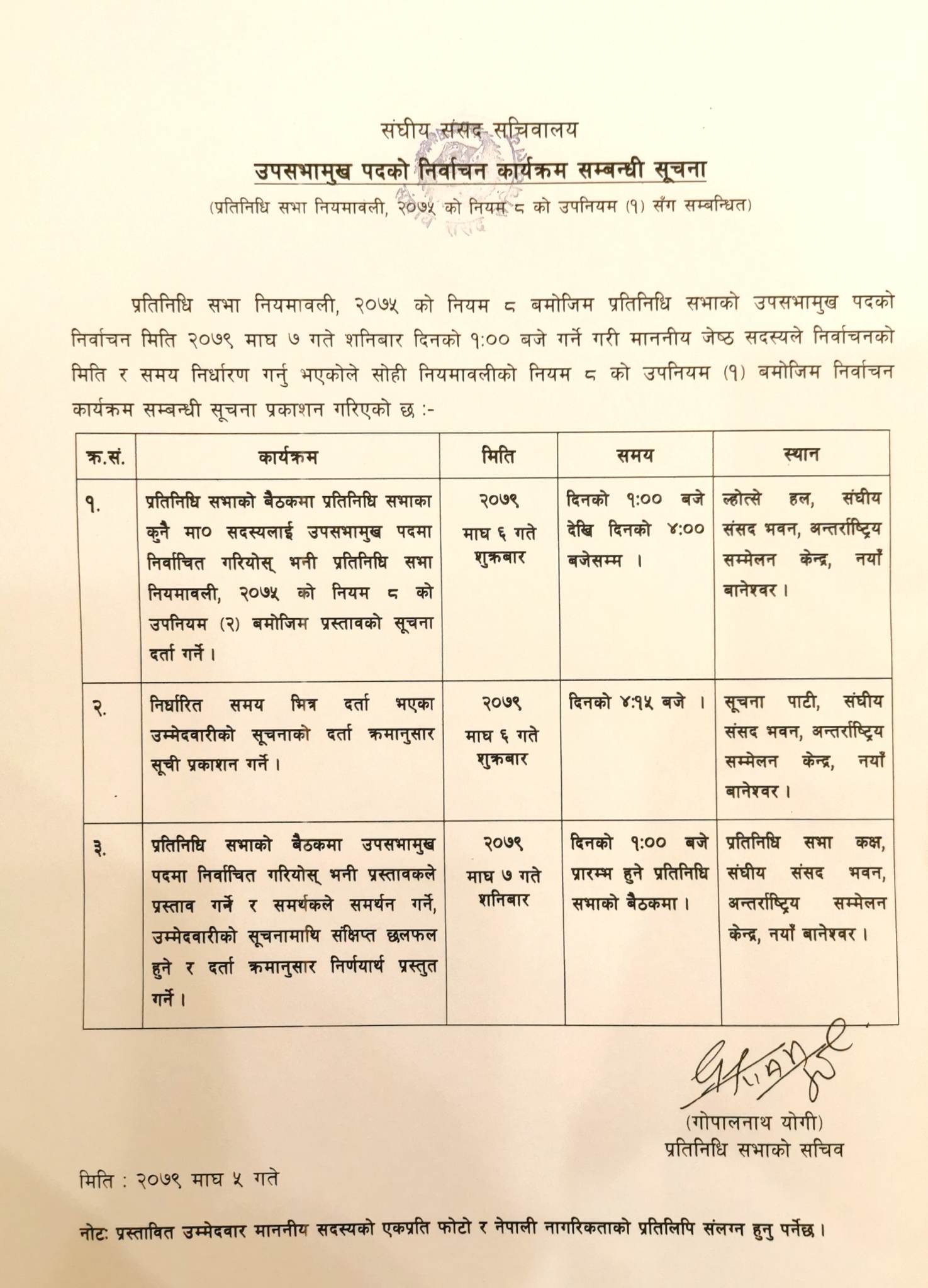 प्रतिनिधि सभाका सचिव गोपालनाथ योगीले सार्वजनिक गरेको निर्वाचन कार्यक्रम अनुसार शुक्रबार (माघ ६ गते) उम्मेदवारहरुको मनोनयन दर्ता गर्ने कार्यक्रम छ । शुक्रबार दिउँसो १ बजेदेखि ४ बजेसम्म, संघीय संसद् भवनको ल्होत्से हलमा उम्मेदवारी मनोनयन गरिने छ ।