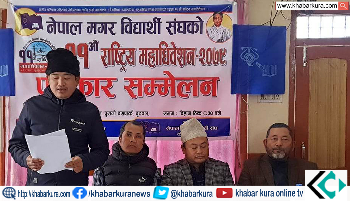 बुटवल । नेपाल मगर विद्यार्थी संघको ११ औं राष्ट्रिय महाधिवेशन भोलीदेखी बुटवलमा सुरु हुने भएको छ । संघले आज बुटवलमा पत्रकार सम्मेलन गर्दै माघ ७ र ८ गते हुने महाधिवेशनको तयारी पुरा भएको जनाएको हो ।