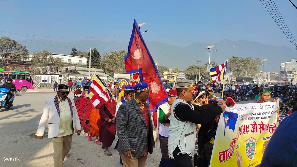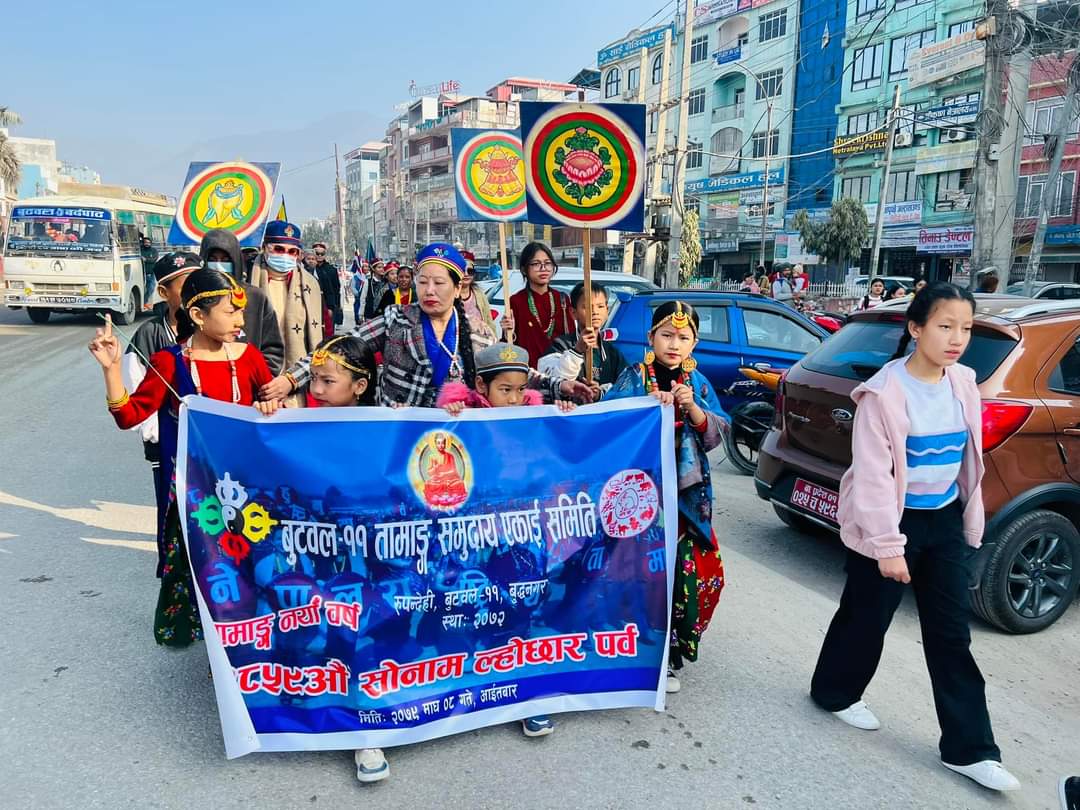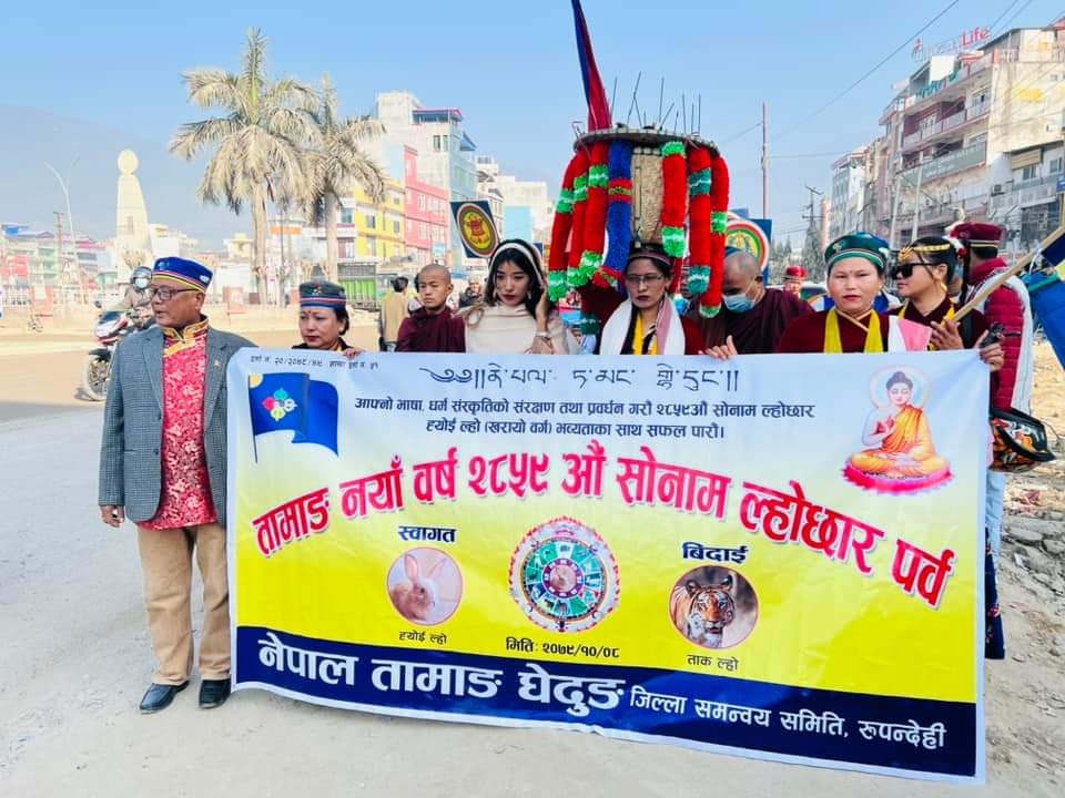 बुटवल । तामाङ नया वर्ष २८५९ औ सोनाम ल्होछारको पर्वको अवसरमा नेपाल तामाङ घेदुङ जिल्ला समन्वय समिति, रुपन्देहीले तामाङ भेषभुषा र पहिचानसहितको झाकी निकालेको छ । यो वर्ष बाघ वर्गलाई बिदाई गर्दै खरायो बर्गलाई स्वागत गर्ने रुपमा नया वर्ष सप्ताहब्यापी कार्यक्रम अन्तरगत मुख्य दिनमा आईतबार सोनाम ल्होछार मनाएको हो ।