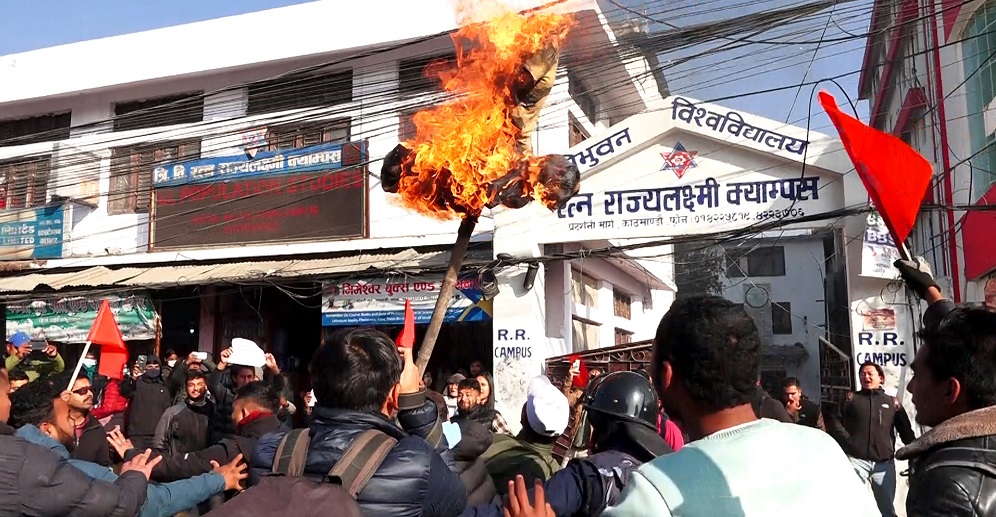 काठमाडौं । काठमाडौंको प्रदर्शनी मार्गस्थित रत्नराज्य (आरआर) क्याम्पस अगाडि शुक्रबार बिहान शिक्षामन्त्री शिशिर खनालको पुत्लादहन गरिएको छ ।