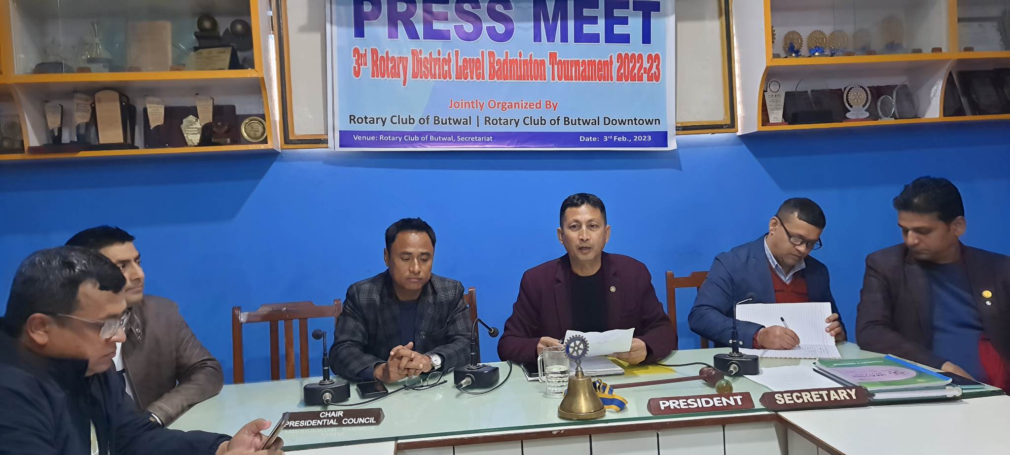 बुटवल । रोटरी क्लब अफ बुटवल र रोटरी क्लब अफ बुटवल डाउनटाउनको संयुक्त आयोजनामा शनिबार तिलोत्तमामा तेस्रो डिष्ट्रिक लेभल रोटरी व्याडमिन्टन २०२२-२३ प्रतियोगिता हुने भएको छ । रोटरी ईन्टरनेश्नल ३२९२ नेपाल भुटान अन्तरगतका क्लबका सदस्य बीचमा भातृत्व विकास गर्ने उद्देश्यका साथ प्रतियोगिता आयोजना गरिएको हो ।