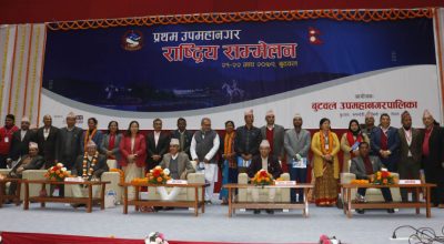 बुटवल । ७ बुँदे बुटवल घोषणा पत्र जारी गर्दै उपमहानगरपालिकाहरुको राष्ट्रिय सम्मेलन सकिएको छ । बुटवल उपमहानगरपालिकाले आयोजना गरेको प्रथम उपमहानगर राष्ट्रिय सम्मेलनले महानगर र उपमहानगरहरुका लागि संघीय संसदबाट छुट्टै ऐन जारी गर्न माग गरेको छ ।