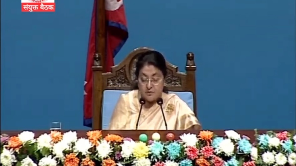 राष्ट्रपति भण्डारीले नयाँ बानेश्वरस्थित संसद् भवनमा संयुक्त बैठकलाई सम्बोधन गरिरहेकी छिन् ।