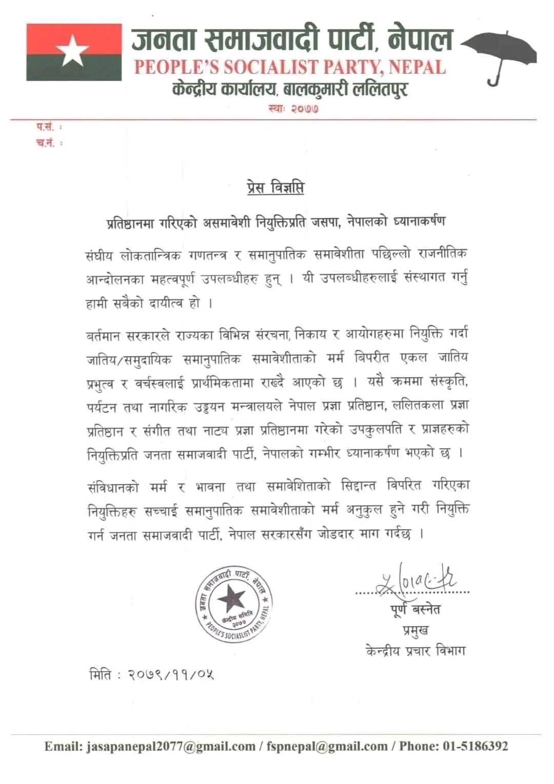 जसपा नेपालका केन्द्रीय प्रचार विभाग प्रमुख पूर्ण बस्नेतले एक विज्ञप्ति निकाल्दै सहमति प्रकट गरेका हुन । ‘सबिधानको मर्म, भावना तथा समावेशीको सिद्धान्त बिपरित गरिएका नियुक्तिहरुलाई सच्चाई समानुपातिक समावेशीको मुल मर्म अनुकुल हुने गरी नियुक्त गर्न जसपा नेपाल, जोडदार माग गर्दछ’ बस्नेतले जारी गरेको बिज्ञप्तिमा भनिएको छ ।