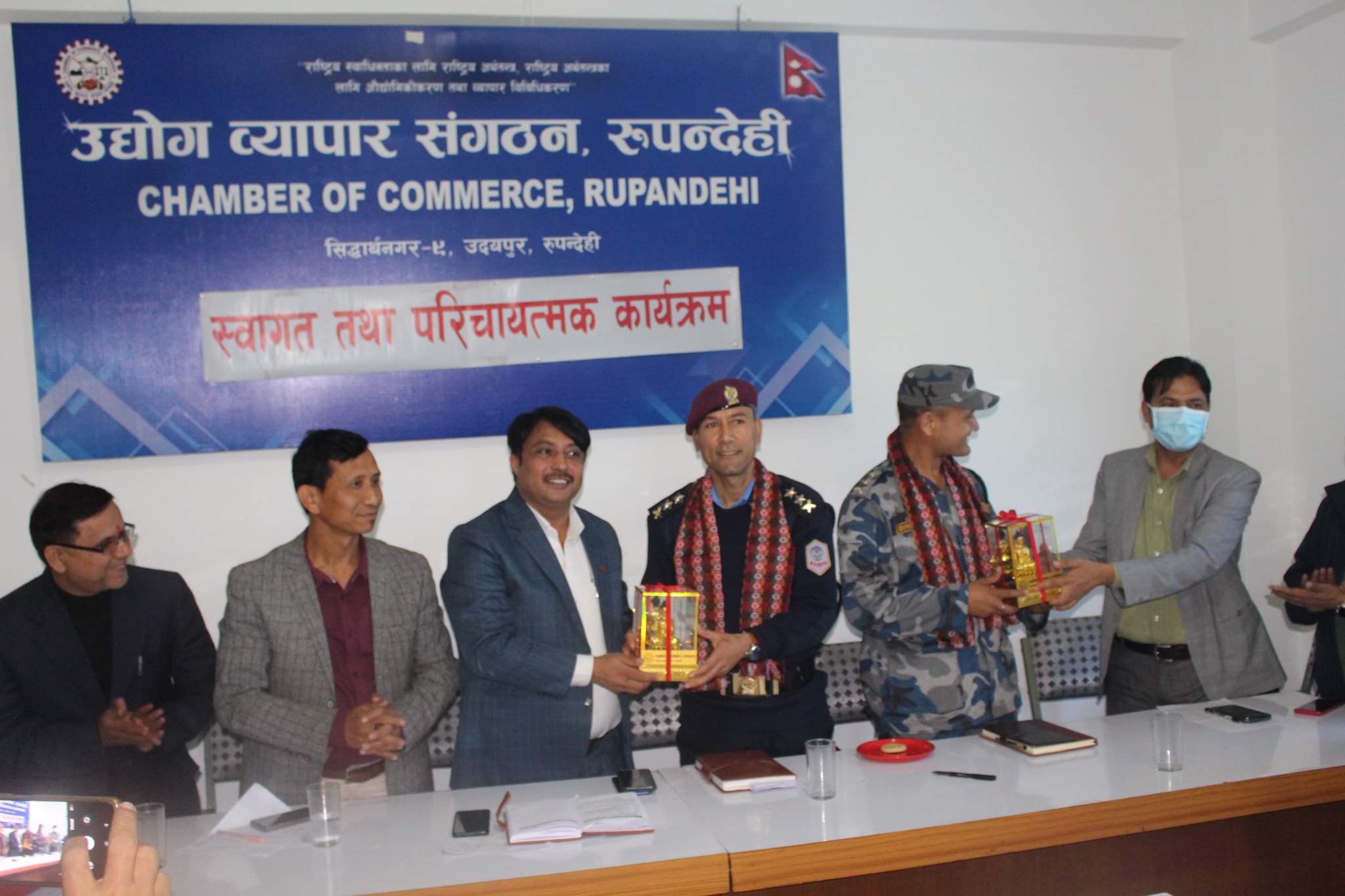 चेम्बर अफ कमर्स, रुपन्देही (उद्योग व्यापार संगठन, रुपन्देही) ले शनिबार भैरहवामा आयोजना गरेको रुपन्देहीका नवआगन्तुक सुरक्षा प्रमुखहरुसँग स्वागत तथा परिचयात्मक कार्यक्रममा बोल्ने उद्योगी व्यवसायीहरुले खुल्ला सीमा कारण चुनौती रहेकाले सीमा व्यवस्थित गर्नुपर्ने बताए ।