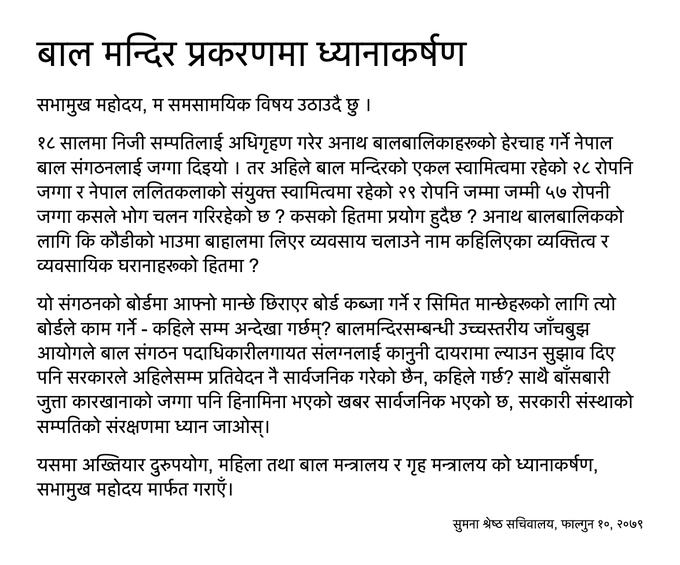 ‘१८ सालमा निजी सम्पत्तिलाई अधिग्रहण गरेर अनाथ बालबालिकाहरुको हेरचाह गर्ने नेपाल बाल संगठनलाई जग्गा दिईयो तर अहिले बाल मन्दिरको एकल स्वामित्व रहेको २८ रोपनी जग्गा र नेपाल ललित कलाको संयुक्त स्वामित्वमा रहेको २९ रोपनी जम्मा ५७ रोपननी जग्गा कसले भोग चलन गरिरहेको छ ? कसको हितमा प्रयोग हुदैँछ ?’ श्रेष्ठले संसद बैठकमार्फत प्रश्न गरेकी छिन, ‘अनाथ बालबालिकाको लागि कि कौडीको भाउमा बहालमा लिएर ब्यावसाय चलाउनका लागि ? नाम कहलिएका ब्यक्तित्व र ब्याबसायिक घरनाहरुको हितमा ?’