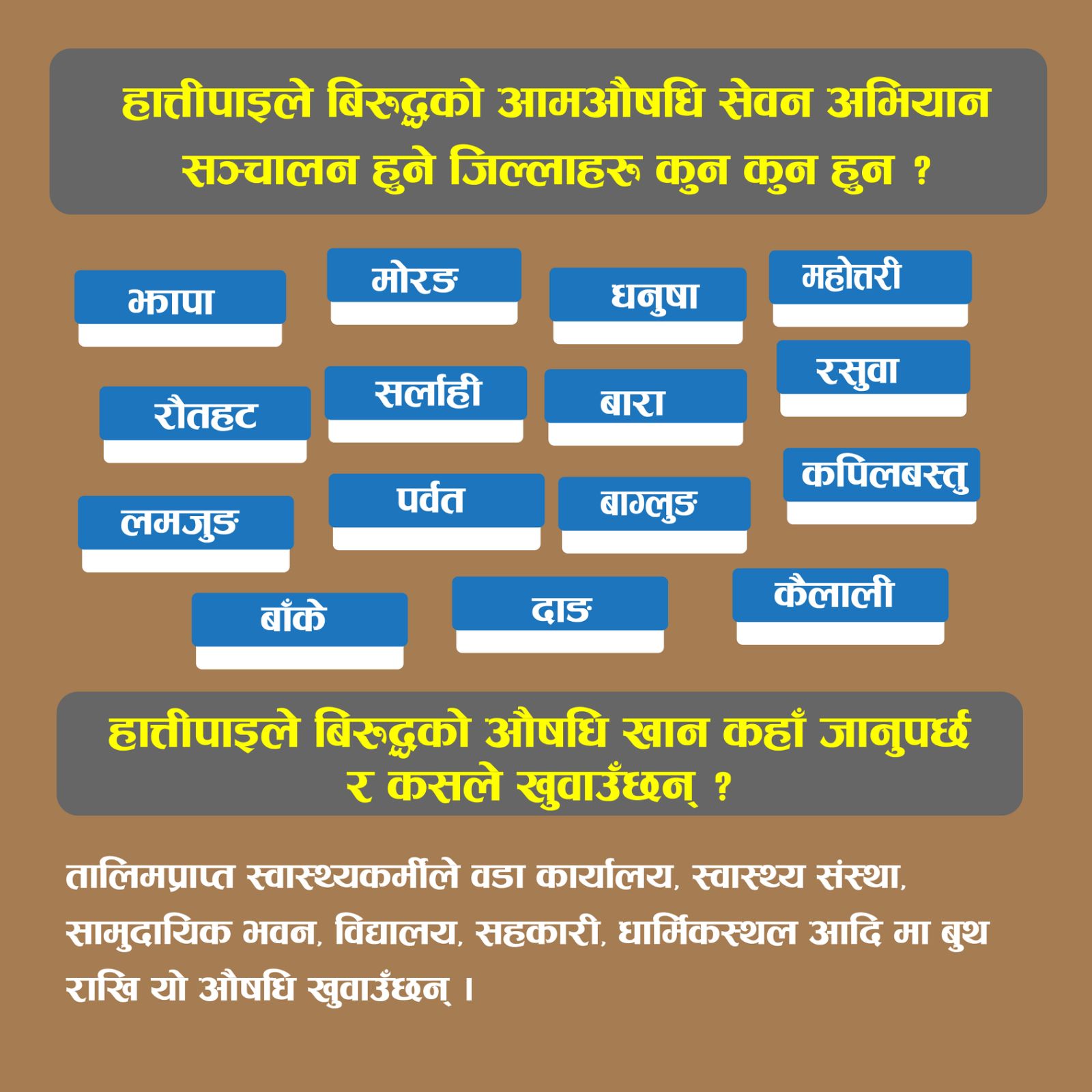 आज अर्थात ११ फागुन देखी २५ फागुनसम्म १५ जिल्लामा हात्तीपाइले रोग विरुद्ध औषधी सेवन अभियान सुरु हुन लागेको हो । कर्णालीबाहेक ६ वटा प्रदेशका १५ जिल्लामा यो अभियान सुरु हुनेछ ।