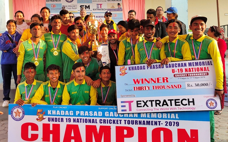 बुटवल । पाँचौ खड्ग प्रसाद गौचन स्मृति यु–१९ राष्ट्रिय क्रिकेट प्रतियोगिता २०७९ को उपाधि धनगढी क्रिकेट एकेडेमीले हात पारेको छ । स्टार क्रिकेट एकेडेमीको आयोजनामा विहिबार भएको फाईनल खेलमा धनगढीले सिईसी, काठमाण्डौमाथि २ विकेटले जित निकाल्दै उपाधि हात पारेको हो । उपाधिसंगै धनगढी नगद ३० हजार रुपैया, कप, मेडल, प्रमाणपत्रबाट पुरस्कृत भए । सिईसी भने नगद १५ हजार रुपैया, कप, मेडल, प्रमाणपत्रमा चित्त बुझायो ।