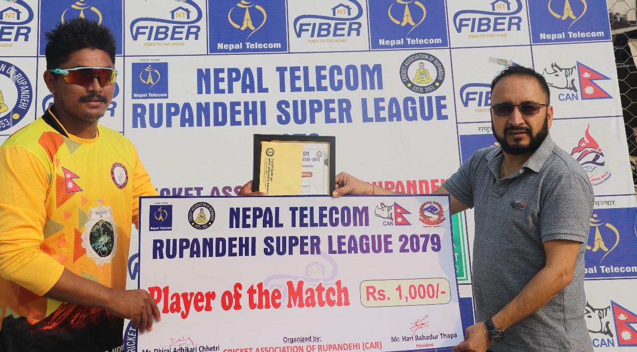 जवाफी ब्याटिङ गरेको शंकरनगर ३४.५ ओभरमा सबै विकेट गुमाउँदै १ सय ४४ रनमै रोकियो । उसलाई सस्तैमा रोक्न बलिङमा जीआरका विनय जिसीले ४, संदीप सुनारले ३, पुरन विकले २ तथा सागर गिरीले १ विकेट लिए । शंकरनगरका प्रवेश सारु मगरले २३, हार्तिक तथाले १९, युवराज सेनले १७ र महेन्द्र सुवेदीले १६ रन बनाए । जीआरका संदीप सुनार म्यान अफ द म्याच भई एक हजार रुपैयाँबाट पुरस्कृत भएको आयोजक संस्था रुपन्देही क्रिकेट संघका उपाध्यक्ष एवं प्रतियोगिता संयोजक धिरज अधिकारीले जानकारी दिए ।
