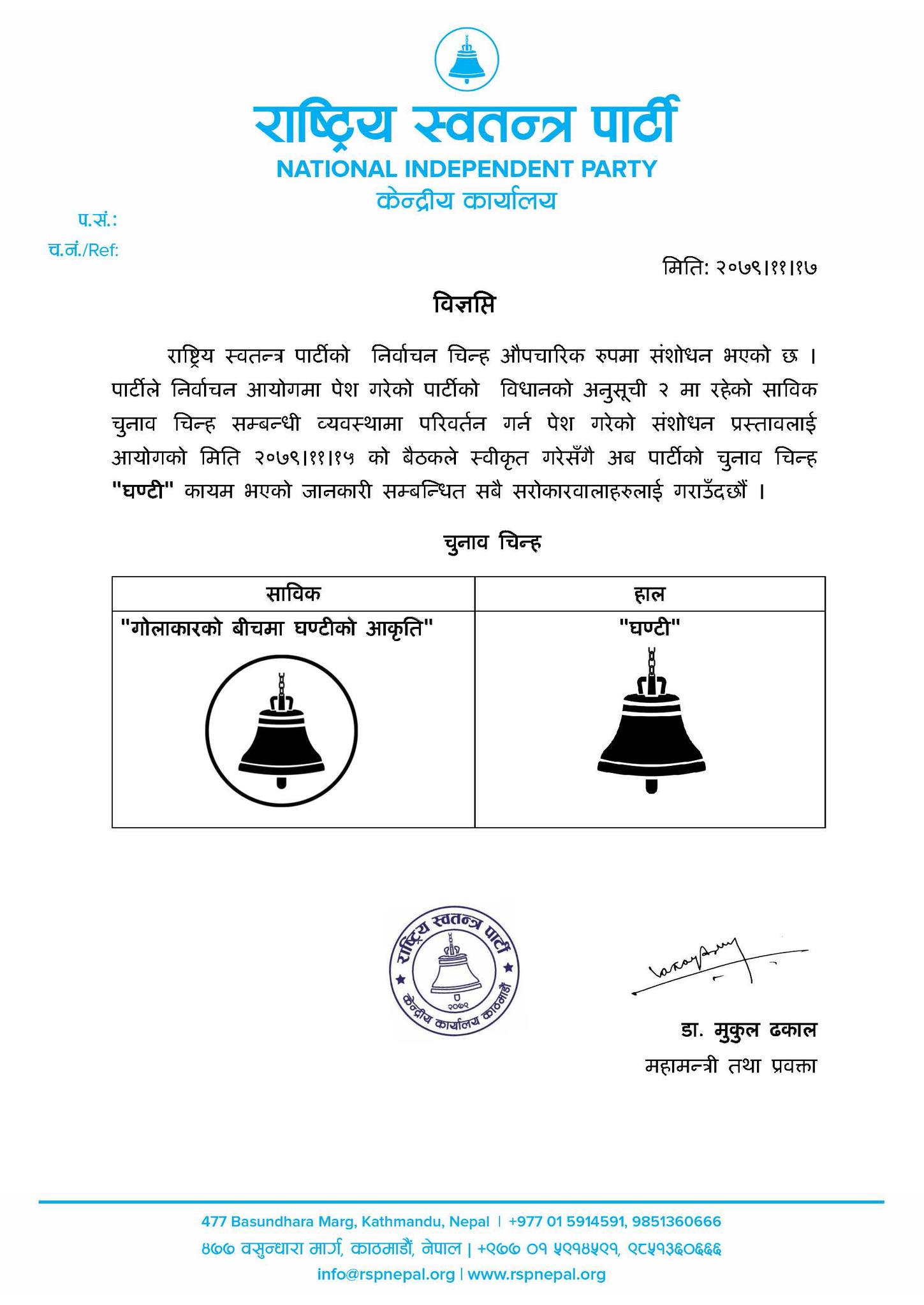रास्वपाका प्रवक्ता एवं महामन्त्री डा मुकुल ढकालले पार्टीले निर्वाचन आयोगमा पेस गरेको पार्टीको विधानको अनुसूची २ मा रहेको साविक चुनाव चिह्नसम्बन्धी व्यवस्थामा परिवर्तन गर्न पेस गरेको संशोधन प्रस्तावलाई निर्वाचन आयोगका बैठकले स्वीकृत गरेसँगै चुनाव चिह्न ‘घण्टी’ कायम भएको जानकारी दिए ।