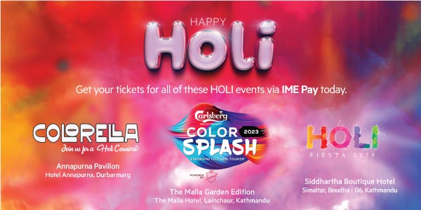 आईएमईले आज जारी गरेको विज्ञप्तिका अनुसार अन्नपूर्ण होटलमा आयोजना हुने कलरेल्ला, द मल्लहोटलको कलर स्प्ल्यास र सिद्दार्थ बुटिक होटलमा आयोजना हुने होली फिएस्ता २०२३ मा सहभागी हुन चाहनेहरुले आईएमई पेबाट टिकट लिन सक्ने छन् ।