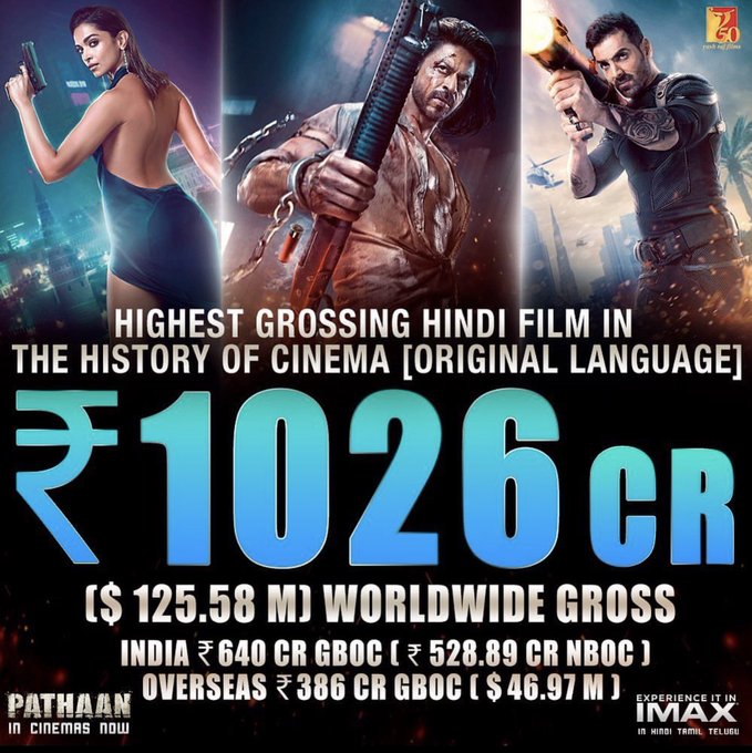 यसअघि दक्षिण भारतीय फिल्म बाहुबली-२ र केएफजी-२ ले बनाएको हजार करोड भन्दा माथीको किर्तिमानलाई तोडदै बलिउडको पठानले सबैभन्दा बढी रकम सकंलन गरेर किर्तिमान कायम गरेको हो ।