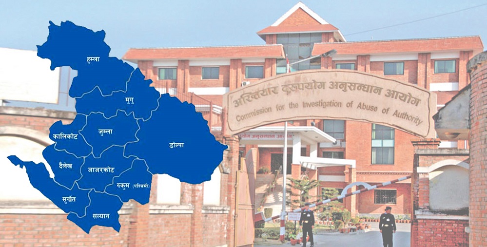 ९ स्थानीय तह रहेको सुर्खेतमा ५९ वटा उजुरी रहेको छ । सबैभन्दा बढी गुर्भाकोटबाट २२ उजुरी परेको छ । दैलेखका ११ स्थानीय तहमा ९६ वटा उजुरी अख्तियारमा दर्ता भएका छन् । जसमा नारायण नगरपालिकाबाट २३ वटा अनियमितताका उजुरी दर्ता भएको छ । कालीकोटका नौ स्थानीय तहमध्ये ५४ वटा उजूरी दर्ता छन् ।