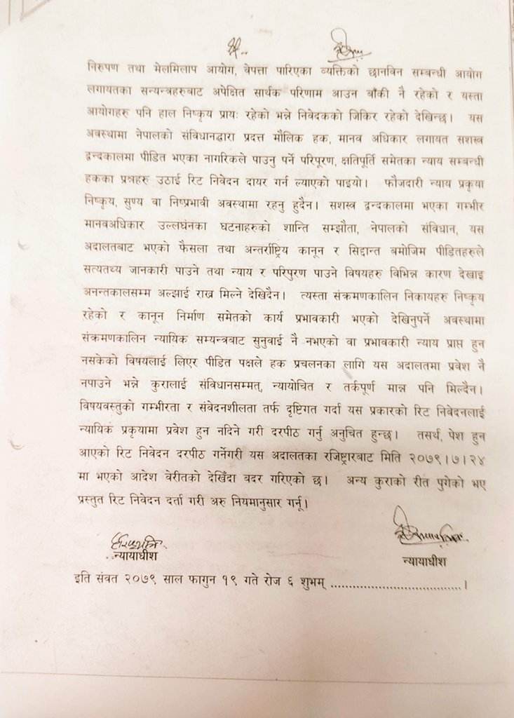 सर्वोच्चको आदेशमा द्वन्द्वपीडितले न्याय पाउने विषयलाई अनन्तकालसम्म अल्झाइ राख्न नमिल्ने उल्लेख छ । आदेशमा भनिएको छ, ‘सशस्त्र द्वन्द्वकालमा भएका गम्भीर मानवअधिकार उल्लघंनका घटनाहरूको शान्ति सम्झौता, नेपालको संविधान, यस अदालतबाट भएका फैसला तथा अन्तर्राष्ट्रिय कानून र सिद्धान्त बमोजिम पीडितहरूले सत्यतथ्य जानकारी पाउने तथा न्याय र परिपुरण पाउने विषयहरू विभिन्न कारण देखाइ अनन्तकालसम्म अल्झाई राख्न मिल्ने देखिँदैन ।’