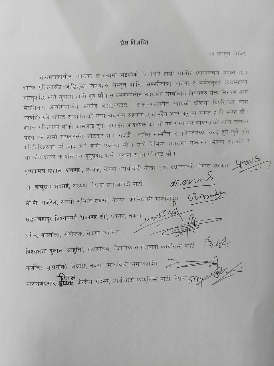 उक्त विज्ञप्तिमा माओवादी केन्द्र अध्यक्ष प्रचण्ड, नेपाल समाजवादी पार्टी अध्यक्ष डा. बाबुराम भट्टराई, नेकपा क्रान्तिकारी माओवादीका स्थायी समिति सदस्य सीपी। गजुरेल, नेकपा प्रवक्ता खड्कबहादुर विश्वकर्मा, नेकपा बहुमतका संयोजक धमेन्द्र बास्तोला, वैज्ञानिक समाजवादी कम्युनिस्ट पार्टी महासचिव विश्वभक्त दुलाल आहुति, नेकपा माओवादी समाजवादी अध्यक्ष कर्णजित बुढाथोकी र माओवादी कम्युनिस्ट पार्टीका सदस्य नारायणप्रसाद धिमालले हस्ताक्षर गरेका छन् ।