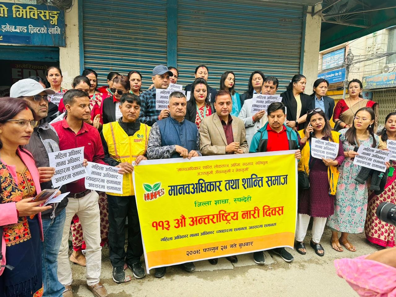 उक्त अवसरमा मानव अधिकार तथा शान्ति समाजका केन्द्रीय सल्लाहकार तथा निवर्तमान सभापती गोविन्द खनालले अझै पनि समाजमा महिलामाथि अन्याय र अत्याचार कायमै रहेकाले त्यसका विरुद्ध सचेतनाको जरुरी रहेको बताए । उनले संवैधानिक रुपमा ३३ प्रतिशत अधिकार लेखिएको भएपनि मन्त्रिमण्डल, सरकारी नियुक्तिमा अझै कार्यान्वयन नभएकाले खबरदारी गर्नुपर्नेमा जोड दिए । नारी दिवसमा गरिएको प्रदर्शनमा मानव अधिकार तथा शान्ति समाजका केन्द्रीय सचिव मिना ढकाल, नेपाल पत्रकार महासंघ रुपन्देहीका सचिव विनोद परियार, तितेपाती वचत तथा ऋण सहकारीका अध्यक्ष कमला कुँवरले नेपाली समाजमा अझै पनि महिलामाथि विभेद रहेकाले समानताका लागि एकजुट हुनुपर्ने बताए ।