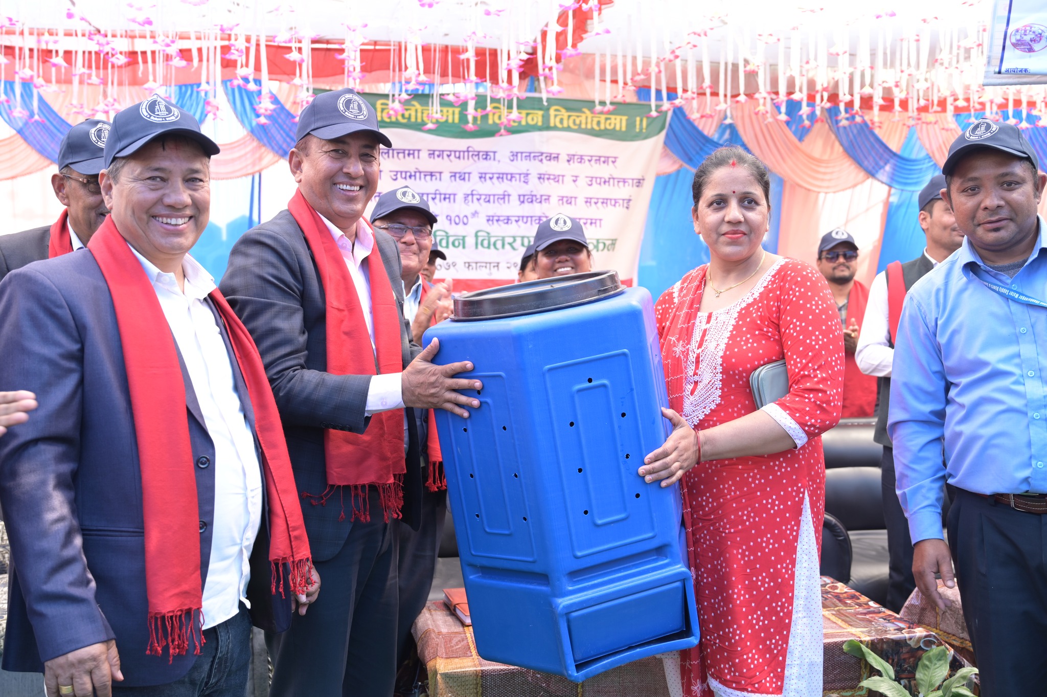 तिलोत्तमा नगरपालिका सञ्चालित समुदायमा आधारित हरियाली प्रवद्र्धन एवं नियमित नगर सरसफाई अभियान एक सयौं श्रृंखलामा पुगेको अवसरमा आयोजित सप्ताहव्यापी कार्यक्रम अन्तर्गत् सोमबार डष्टविन वितरण गरिएको हो । यसअघि आनन्दवन शंकरनगर खानेपानी संस्थाले आफ्ना उपभोक्तालाई नगरपालिकासँगको लागत साझेदारी समेतमा कुहिने र नकुहिने फोहोर राख्ने डष्टविन वितरण गरेको थियो ।