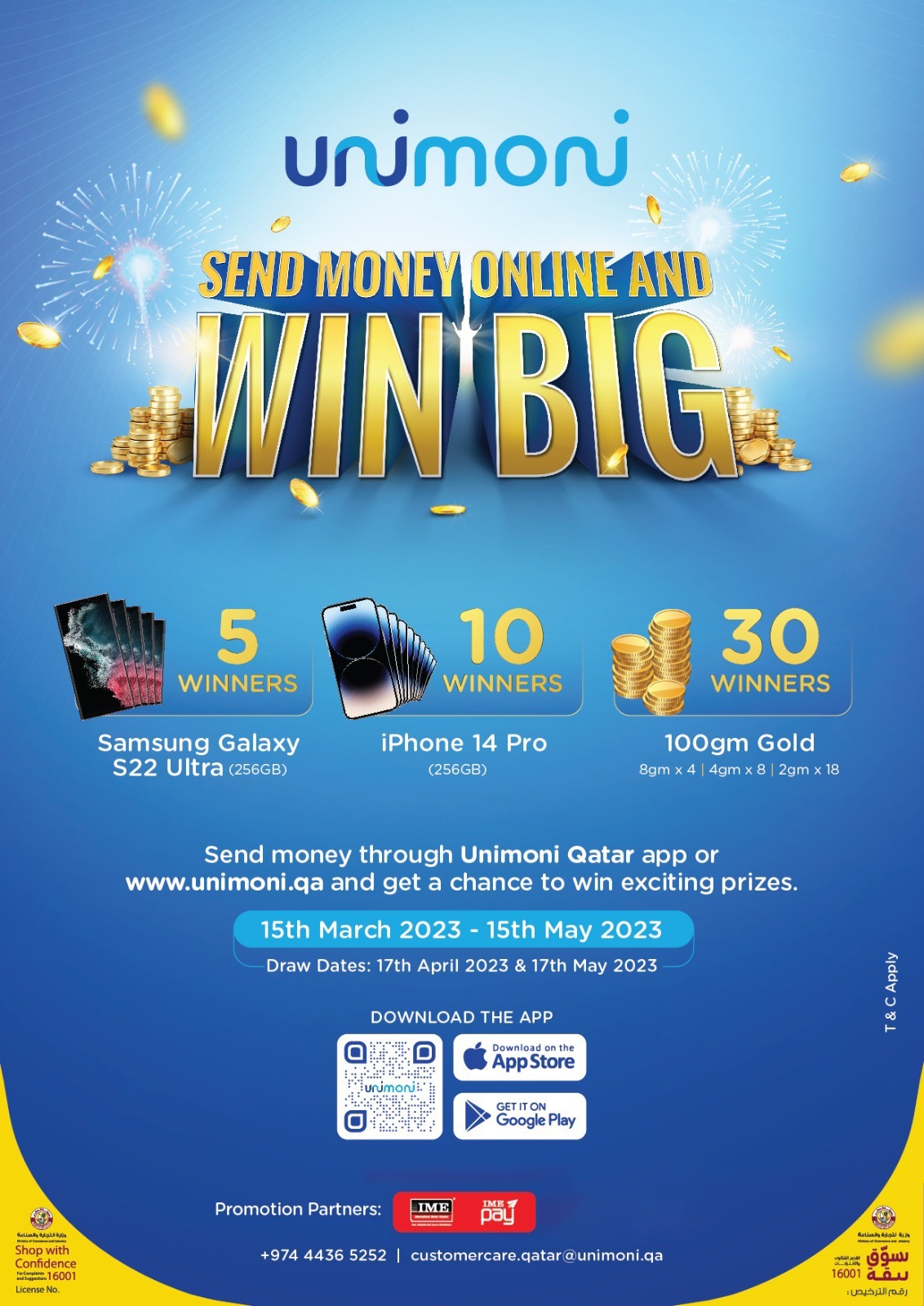 विन बिग क्याम्पियनमा सम्पुर्ण सेवाग्राहीहरू युनिमनि कतार मोबाइल एप अथवा युनिमनीको अनलाइन पोर्टल æwww.unimoni.qa” मार्फत आइएमईमा पैसा पठाउँदा भाग्यशाली १० जना विजेताले IPHONE 14 PRO, ५ जना विजेताले SAMSUNG GALAXY S22 Ultra साथै ३० जना सेवाग्राहीहरूले २ ग्राम, ४ ग्राम र ८ ग्राम गरी जम्मा १०० ग्राम सुन जित्न सक्नेछन् ।