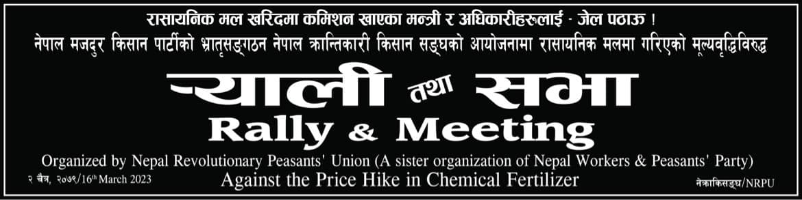 रासायनिक मलमा गरिएको मूल्यवृद्धिविरुद्ध बिहीबार अपरान्ह काठमाडौंमा प्रदर्शनमा उत्रिन लागेको हो ।