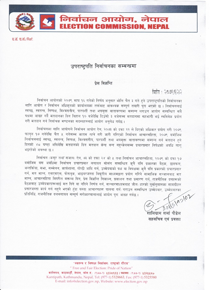 शुक्रबार हुने उपराष्ट्रपतिको निर्वाचनको तयारी पूरा भइसकेको जानकारी दिँदै प्रवक्ता पौडेलले जारी गरेको विज्ञप्तिमा भनिएको छ, ‘निर्वाचन (कसुर तथा सजाय) ऐन, ७३ को दफा २४ को ५ तथा निर्वाचन आचारसंहिता, २०७९ को दफा १७ बमोजिम यस अवधिमा निर्वाचन प्रचारप्रसार लगायत सोसँग सम्बन्धित कुनै पनि प्रकारका बैठक, छलफल, अन्तक्रिया, सभा, सम्मेलन, कार्यशाला, गोष्ठी आदि गर्न, उम्मेदवाको पक्ष वा विपक्षमा कुनै पनि प्रकारको प्रचारप्रसार गर्न, मत माग्न, एसएमएस, फेसबुक, भाइबरजस्ता विद्युतीय माध्यमद्वारा प्रयोग गरिने सामाजिक सञ्जालबाट मत माग्न, आचारसंहिता विपरीत वक्तव्य दिन, प्रेस विज्ञप्ति निकाल्न, प्रकाशन तथा प्रसारण गर्न, राजनीतिक दलहरूको बैठकबाट उम्मेदवारहरूलाई मत दिने वा नदिने निर्णय गर्न, सञ्चारमाध्यमबाट जीत÷हारको पूर्वानुमानका सामग्रीहरु प्रसारजस्ता कार्य गर्न नहुने भएको हुँदा यस्ता आचारणहरू पालना गर्न÷गराउन सम्बन्धित उम्मेदवार, उम्मेदवारका प्रतिनिधि, राजनीतिक दललगायत सम्पूर्ण सरोकारवालालाई आयोग पुनः आग्रह गर्दछ ।’