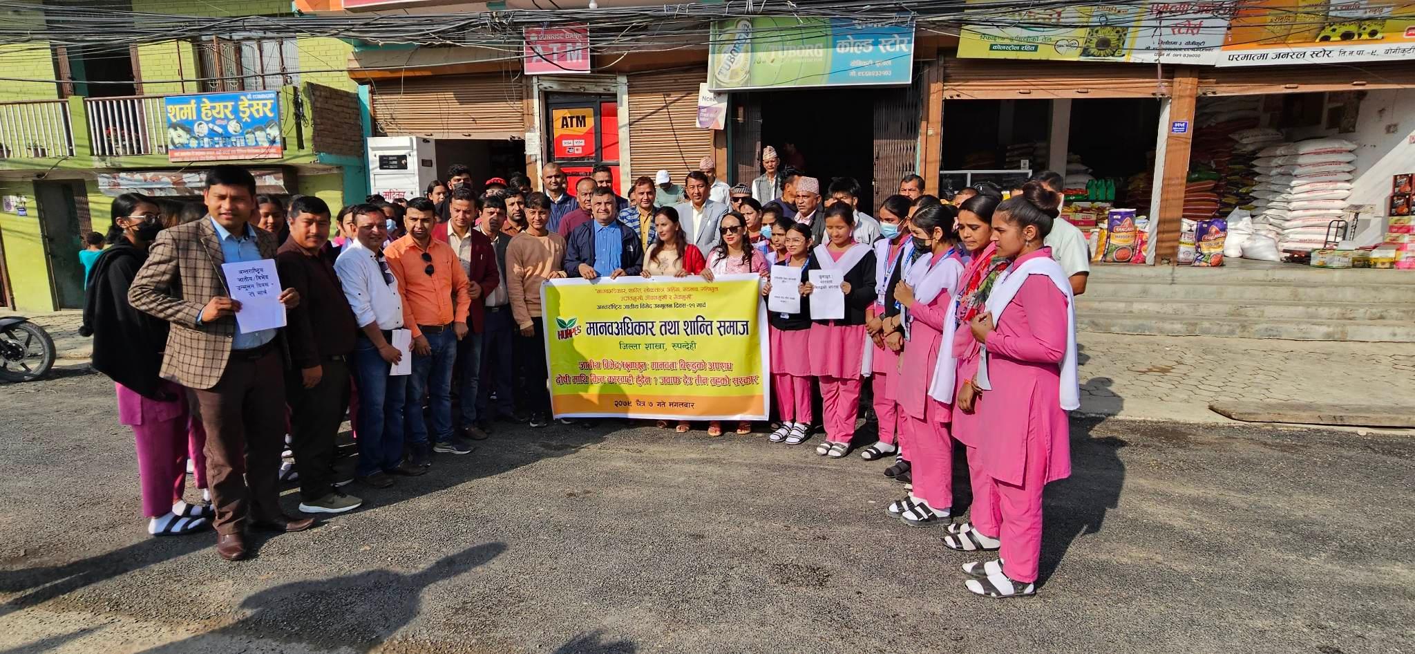 बुटवल । मानवअधिकार तथा शान्ति समाज रुपन्देहीले तिलोत्तमामा बिरोध प्रदर्शन गरेको छ । समाजले अन्तराष्ट्रिय जातीय विभेद उन्मुलन दिवस २१ मार्चको सन्दर्भमा प्ले कार्डसहित आधा घण्टा विरोध प्रदर्शन गरेको हो ।