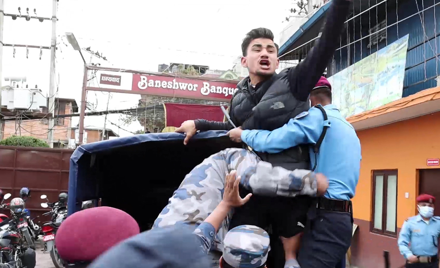 उनले ‘आतंककारी प्रचण्ड मुर्दावाद’ भन्दै नारा लगाएका थिए । त्यसबीचमा अर्को एक जना युवाले प्रहरीले मुख बन्द गर्न पाइँदैन भन्दै नारा लगाए ।