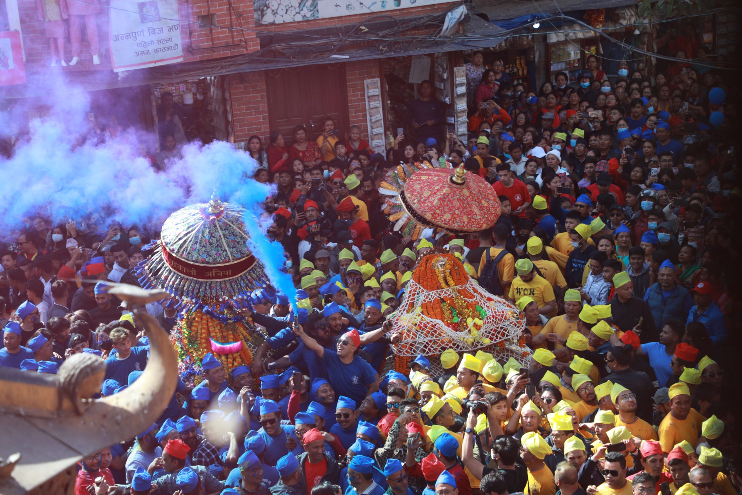 काठमाडौं । काठमाडौंको अति व्यस्त बजार असन चोकमा बुधबार लुमरी अजिमा (भद्रकाली), ओतु अजिमा र कंग अजिमाको जात्रा गरिँदै । हरेक वर्ष घोडाजात्राको भोलिपल्ट यो जात्रा गर्ने प्रचलन रहेको छ । तस्वीर : रत्न श्रेष्ठ/रासस