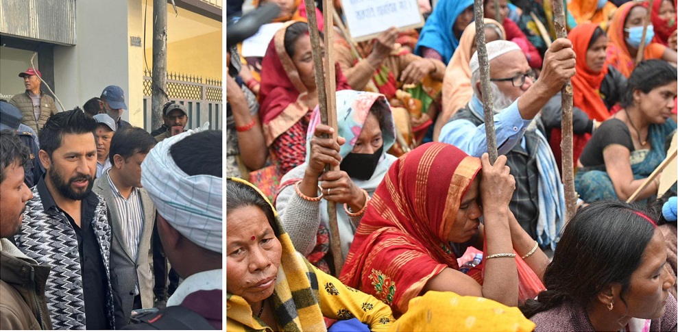 प्रहरीले प्रधानमन्त्री निवासमा पुग्न नदिन टंगालबाटै निषेधित क्षेत्र बनाएको थियो । निषेधित क्षेत्रमा रोकेपछि पीडितहरुले टंगालमै प्रदर्शन गरेका छन् । उनीहरुले तमसुक व्यस्था खारेज गर, मिटरब्याजीलाई कारबाही गर, जफत गरिएको सम्पत्ति फिर्ता गर जस्ता ना लगाएका छन् ।
