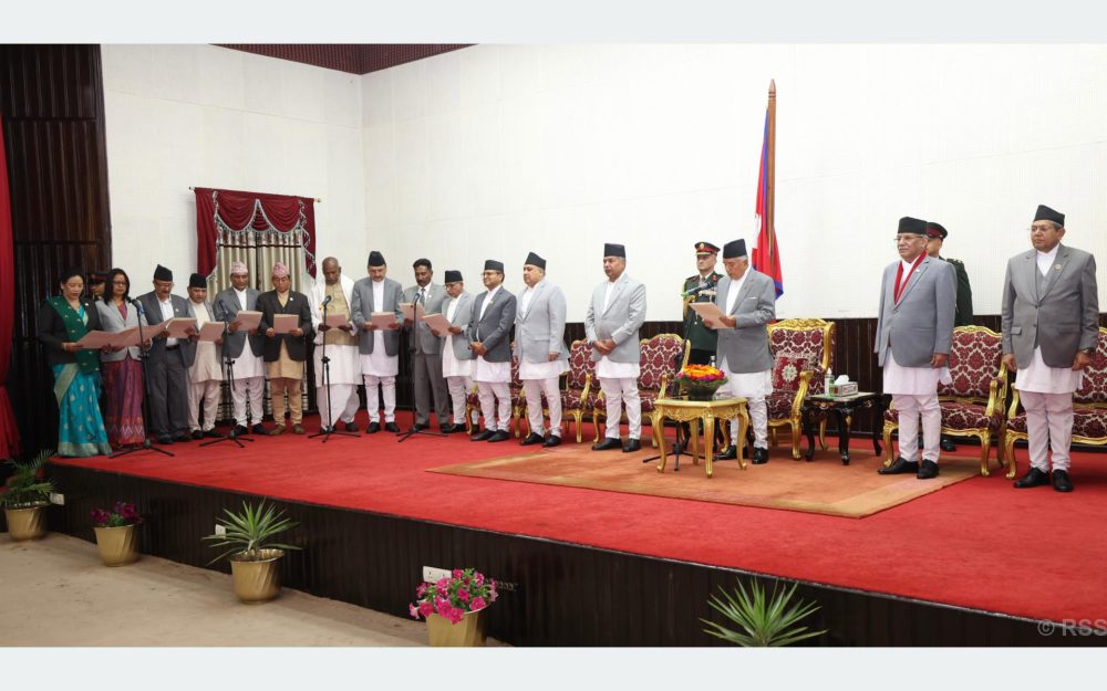 राष्ट्रपति कार्यालय शीतल निवासमा आयोजित विशेष समारोहमा राष्ट्रपति पौडेलले उपप्रधानमन्त्री एवम् मन्त्रीहरुलाई शपथ गराएका हुन् । सो अवसरमा उपराष्ट्रपति रामसहायप्रसाद यादव, प्रधानमन्त्री पुष्पकमल दाहाल ‘प्रचण्ड’, सभामुख देवराज घिमिरे, राष्ट्रियसभाका अध्यक्ष गणेशप्रसाद तिमिल्सिना, कायममुकायम प्रधानन्यायाधीश हरिकृष्ण कार्की, संवैधानिक निकायका प्रमुख, वरिष्ठ सञ्चारकर्मीलगायतको सहभागिता थियो ।