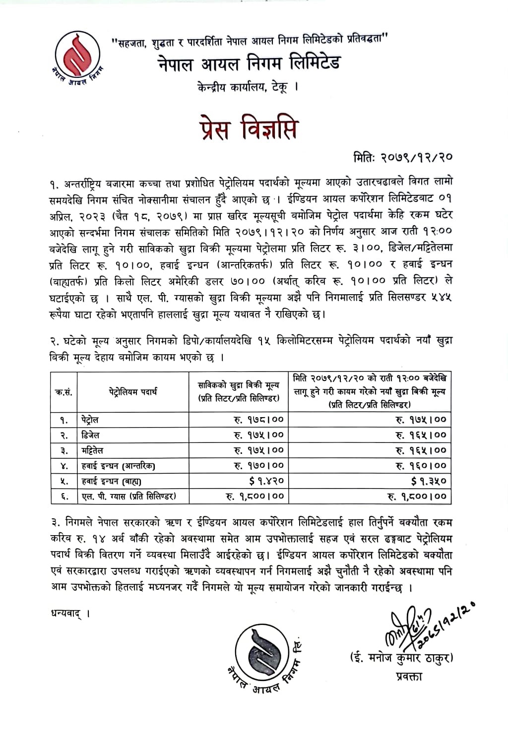 नयाँ मूल्यसूची सोमबार मध्यराति १२ बजेदेखि लागू हुने निगमले जनाएको छ।