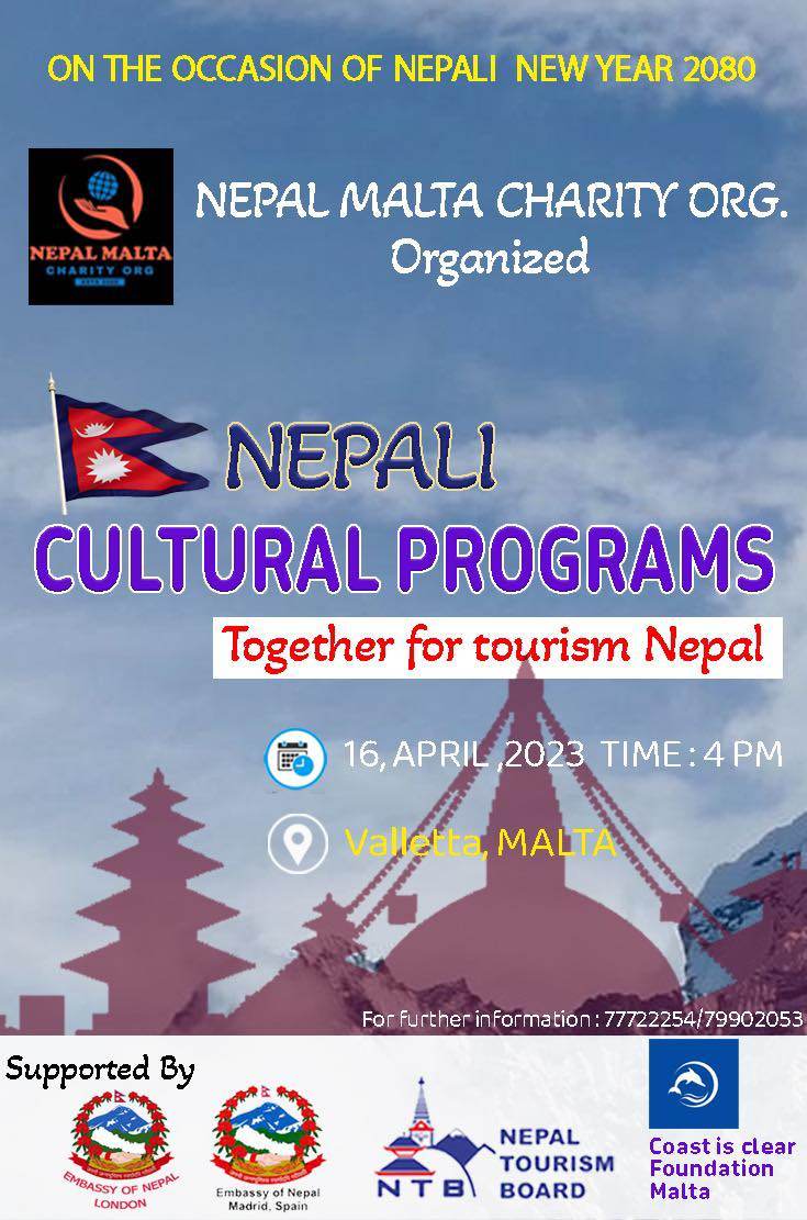 रोजगारीको शिलशिलामा कर्मभुमि माल्टामा रहदै गर्दा पनि आफ्नो मातृभूमिलाइ चिनाउनको लागि नेपालि नया बर्ष २०८० सालको अबसर पारेर अप्रिल १६ तारिकका दिन माल्टाको राजधानी भ्यालेटामा नेपाल माल्टा च्यारिटी अर्गनाईजेसनले सांस्कृतिक कार्यक्रमका साथ नेपाल डे आयोजना गरिनेछ ।