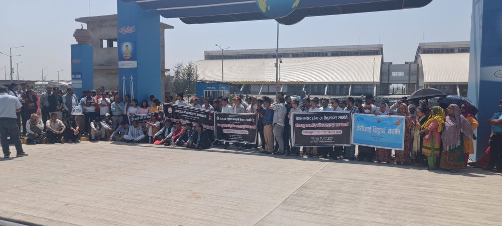 मुलुकको ४० अर्ब लगानी भई सञ्चालनमा आएको विमानस्थल पूर्ण रुपमा सञ्चालनका लागि सरकार, मन्त्रालय र सरोकारवाला निकायले चासो नदिएको कारण निजी क्षेत्रको लगानी समेत संकटमा रहेको भन्दै व्यावसायिक संस्थाहरु सवमानस्थलको मुख्य प्रवेशद्वारमा धर्ना दिएका हुन् ।
