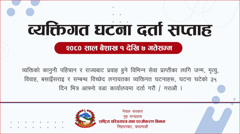 शुक्रबारदेखि ७ वैशाखसम्म देशैभर व्यक्तिगत घटना दर्ता सप्ताह सञ्चालन भएको छ । १ वैशाखबाट गृह मन्त्रालयअन्तर्गतको राष्ट्रिय परिचयपत्र तथा पञ्जीकरण विभागले व्यक्तिगत घटना समयमै दर्ता गराउन नागरिक जागरुक गराउन सप्ताहव्यापी अभियान सुरु गरेको हो ।