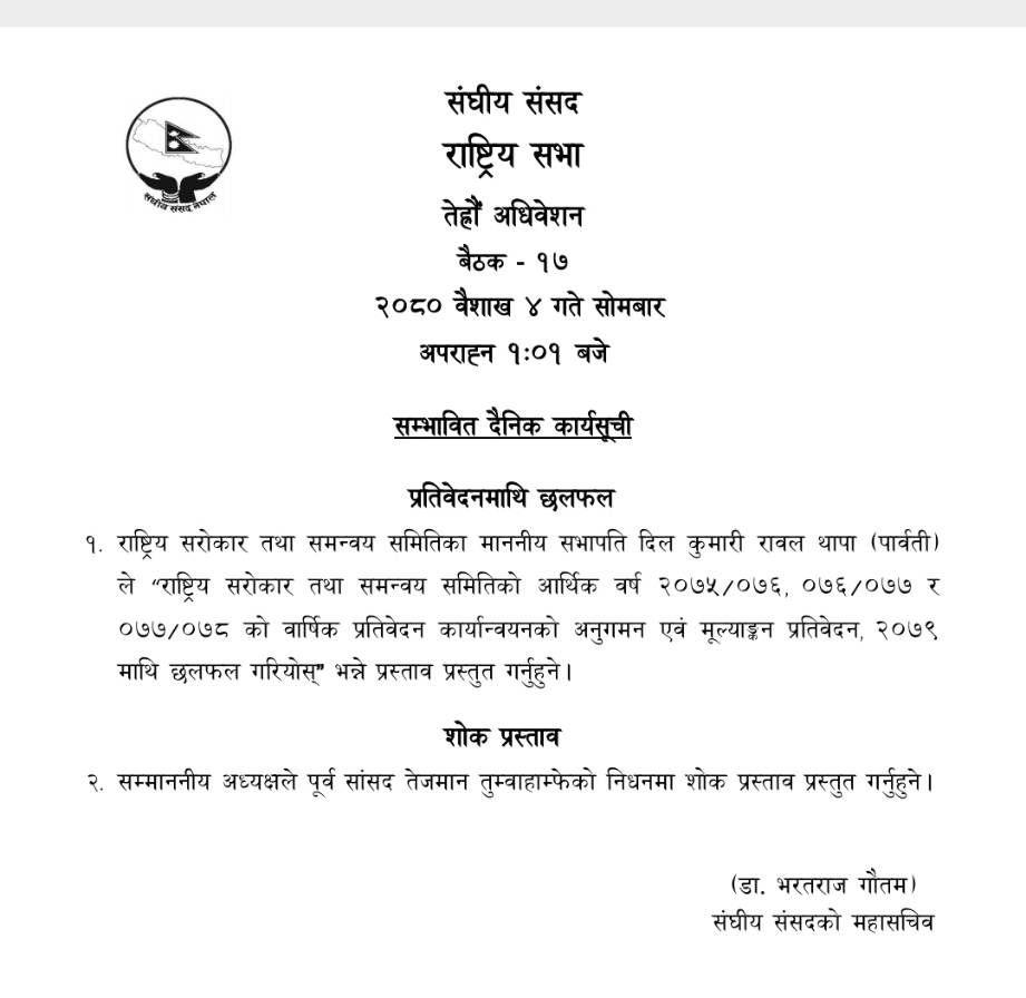 राष्ट्रियसभा अध्यक्ष गणेश तिमिल्सिनाले पूर्वसांसद तेजमान तुम्वाहाम्फेको निधनमा शोक प्रस्ताव प्रस्तुत गर्ने कार्यसूची रहेको छ ।