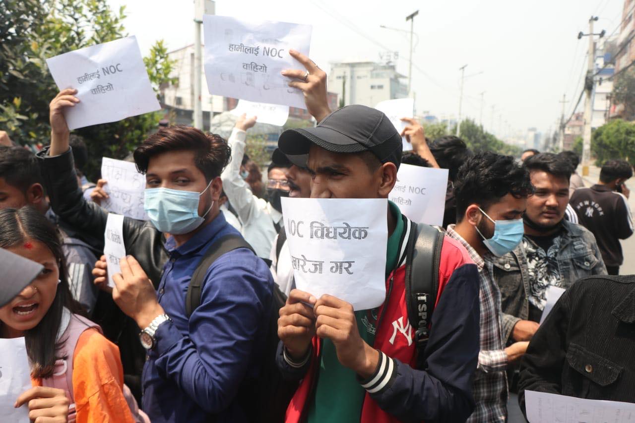 काठमाडौं । अध्ययनका लागि विदेश जाने विद्यार्थीहरुलाई नो अब्जेक्सन लेटर (एनओसी) दिन रोक लगाइएको भन्दै विद्यार्थीहरु सडकमा उत्रिएर प्रदर्शन गरेका छन् ।
