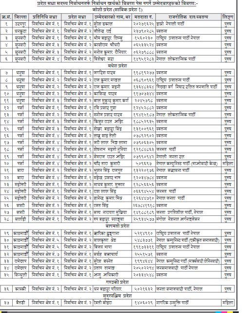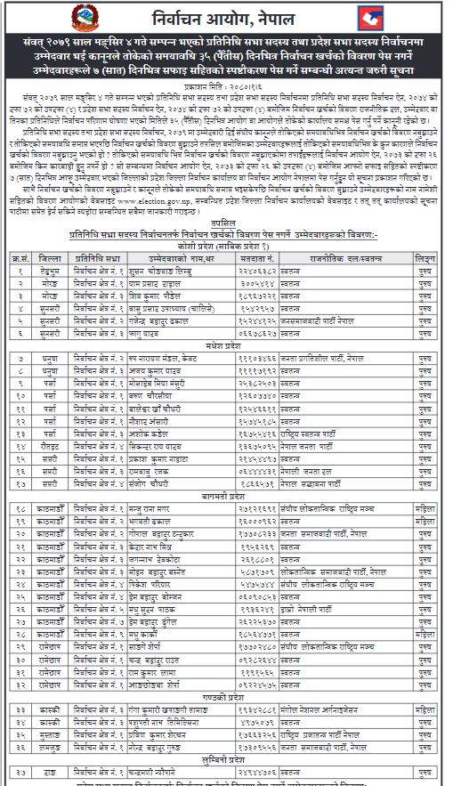 प्रतिनिधिसभा र प्रदेशसभाका उम्मेदवारले खर्च विवरण पेस नगर्नुको चित्तबुझ्दो कारण पेस गर्न नसकेमा कारबाही प्रक्रियासमेत अघि बढाइने आयोगले जारी गरेको सुचनामा उल्लेख गरिएको छ ।