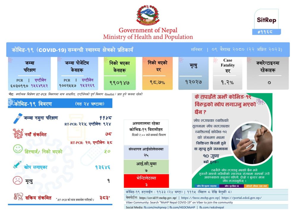 पछिल्लो २४ घन्टामा देशभरबाट १ हजार १४८ नमुना परीक्षण गर्दा ७८ जनामा संक्रमण पुष्टि भएको मन्त्रालयले जनाएको छ। सोही अवधिमा भेरी अस्पताल नेपालगन्जमा उपचाररत एक जनाको आज मृत्यु भएको छ ।