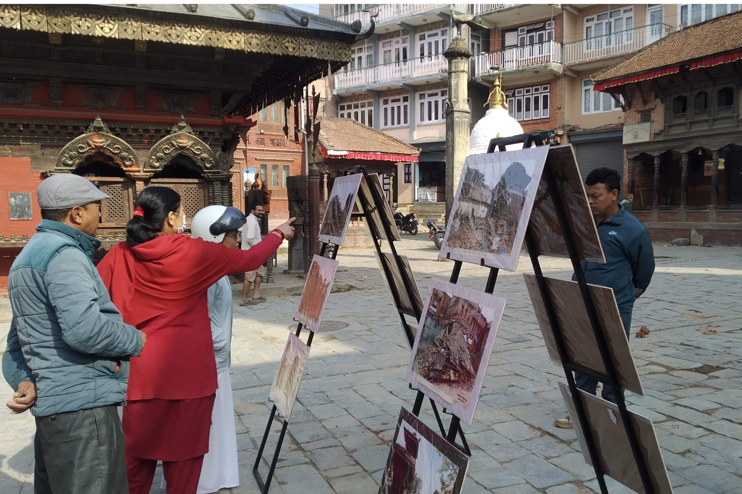 मध्यपुर थिमि । नेपाल रेडक्रस सोसाईटी मध्यपुर थिमि उपशाखाको आयोजनामा विसं २०७२ वैशाख १२ गतेको स्मरणमा भूकम्पसम्बन्धी जनचेतना जगाउन प्रदर्शित २०७२ सालको भूकम्पका तस्बिर अवलोकन गर्दै स्थानीयवासी । तस्बिर : रत्न श्रेष्ठ/रासस