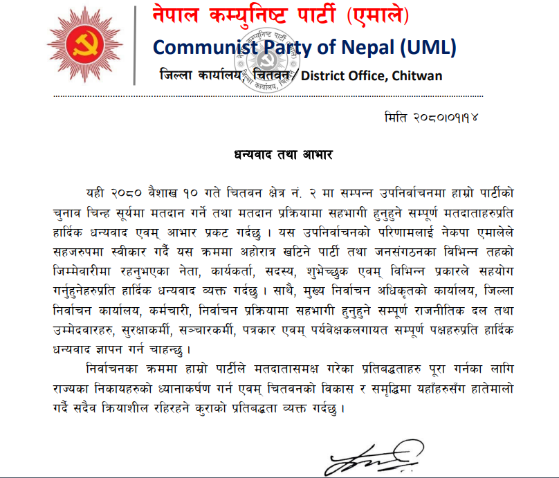 न्यौपानेले सन्देशमा चितवन-२ को उपनिर्वाचनमा आफ्नो पार्टी एमालेको सूर्य चिन्हमा मतदान गर्ने सम्पूर्ण मतदातालाई धन्यवाद दिएका छन् ।