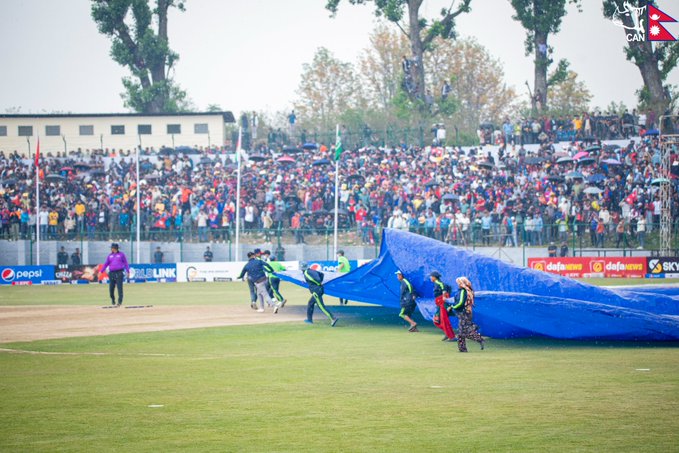 टस हारेर पहिला ब्याटिङको निम्तो पाएको नेपालले २३.२ ओभरमा ३ वटा विकेट गुमाउँदै १ सय ४१ रन बनाइरहेको बेला खेल मैदानमा पानी परेको हो । सुरूवातीमा  विष्फोटक ब्याटिग गरे पनि लगालार तीन  विकेट गुमाएपछि नेपाल दवावमा परेको थियो ।