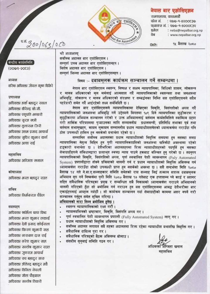 देशैभरी आन्दोलन गर्नका लागि केन्द्रिय बारले माताहातका समितिहरुलाई निर्देशनसमेत दिएको छ ।