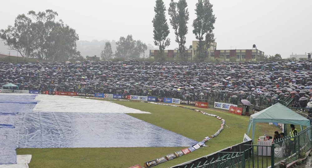 वर्षाले निकै प्रभावित बनेको खेल दुई पटक रोकिएको थियो । त्रिवि क्रिकेट मैदानमा यूएईले १६ ओभरमा पाँच विकेट गुमाएर ६० रन जोड्दा वर्षा भएपछि पहिलोपटक खेल रोकिएको थियो । त्यसबेला खेल वर्षाका कारण आधा घण्टा रोकिएको थियो । यस्तै, २७.३ ओभरमा नौ विकेट गुमाएर १०६ रन बनाएको अवस्थामा पुनः वर्षा भएपछि खेल दोस्रोपटक रोकिएको थियो ।