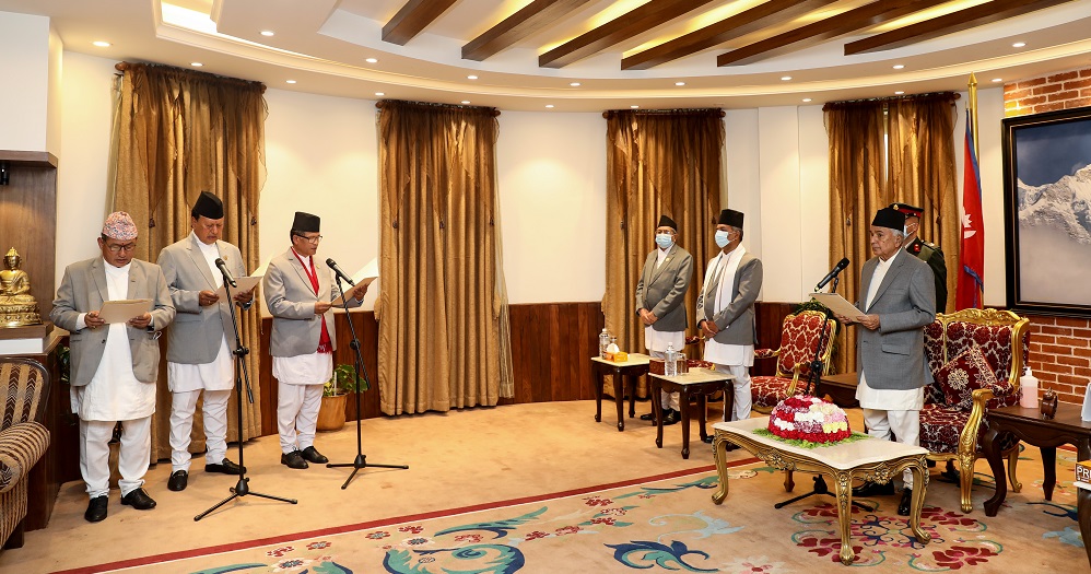 कानुन, न्याय तथा संसदीय मामिलामन्त्री धनराज गुरुङ, स्वास्थ्य तथा जनसङ्ख्यामन्त्री मोहनबहादुर बस्नेत र युवा तथा खेलकुदमन्त्री डिगबहादुर लिम्बूले शपथ लिएका छन्। राष्ट्रपति कार्यालय शीतल निवासमा आज आयोजित विशेष समारोहमा राष्ट्रपति रामचन्द्र पौडेलले उनीहरुलाई शपथ गराएका हुन् ।