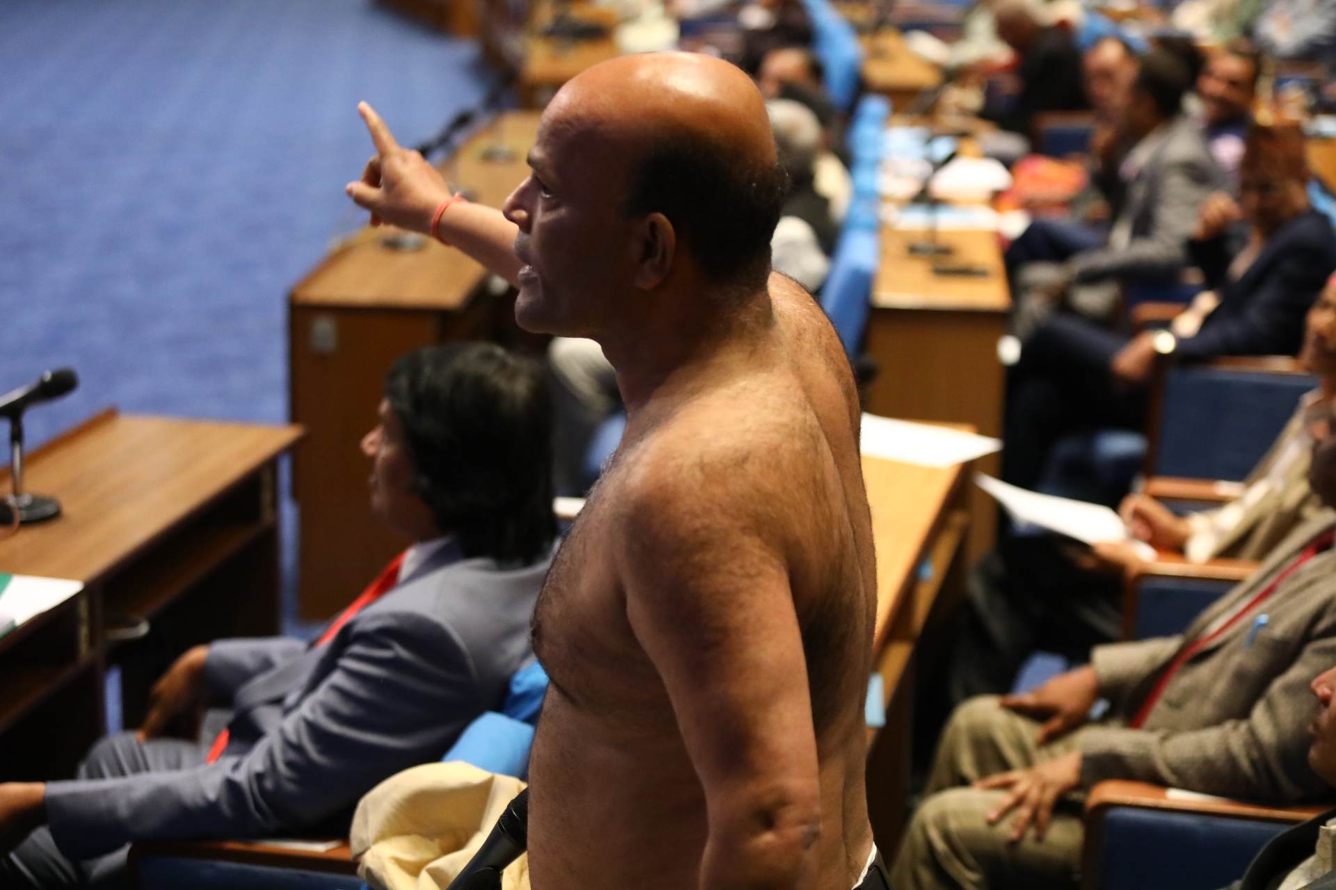 यसपछि आफूले लगाएको लुगा फुकालेर विरोध जनाए । यसपछि सभामुख घिमिरेले बारम्बार उनलाई चेतावनी दिँदै सभ्य बन्न आग्रह गरे । सभामुख घिमिरेले असभ्य बोल्न र अशिष्ट व्यवहार नदेखाउन चेतावनी दिए । सभामुख घिमिरेको बारम्बारको चेतावनीपछि उनले लुगा लगाए ।
