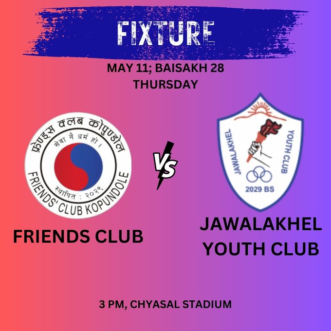 अखिल नेपाल फुटबल संघ (एन्फा)का अनुसार आज फ्रेन्डस क्लब र जावलाखेल युथ क्लब बिच भिडन्त हुनेछ ।