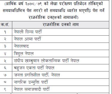 आयोगले स्पष्टीकरण सोधेका ९ वटा राजनीतिक दलहरुमा नेपाली ग्रिन्स पार्टी, नेपाल आमा पार्टी, नेपालबाद, त्रिमुल नेपाल, संघीय खम्बुवान लोकतान्त्रिक पार्टी, बहुजन एकता पार्टी नेपाल, जनता प्रगतिशिल पार्टी नेपाल, नागरिक उन्मुक्ति पार्टी र नेपाल समाजवादी पार्टी रहेका छन ।