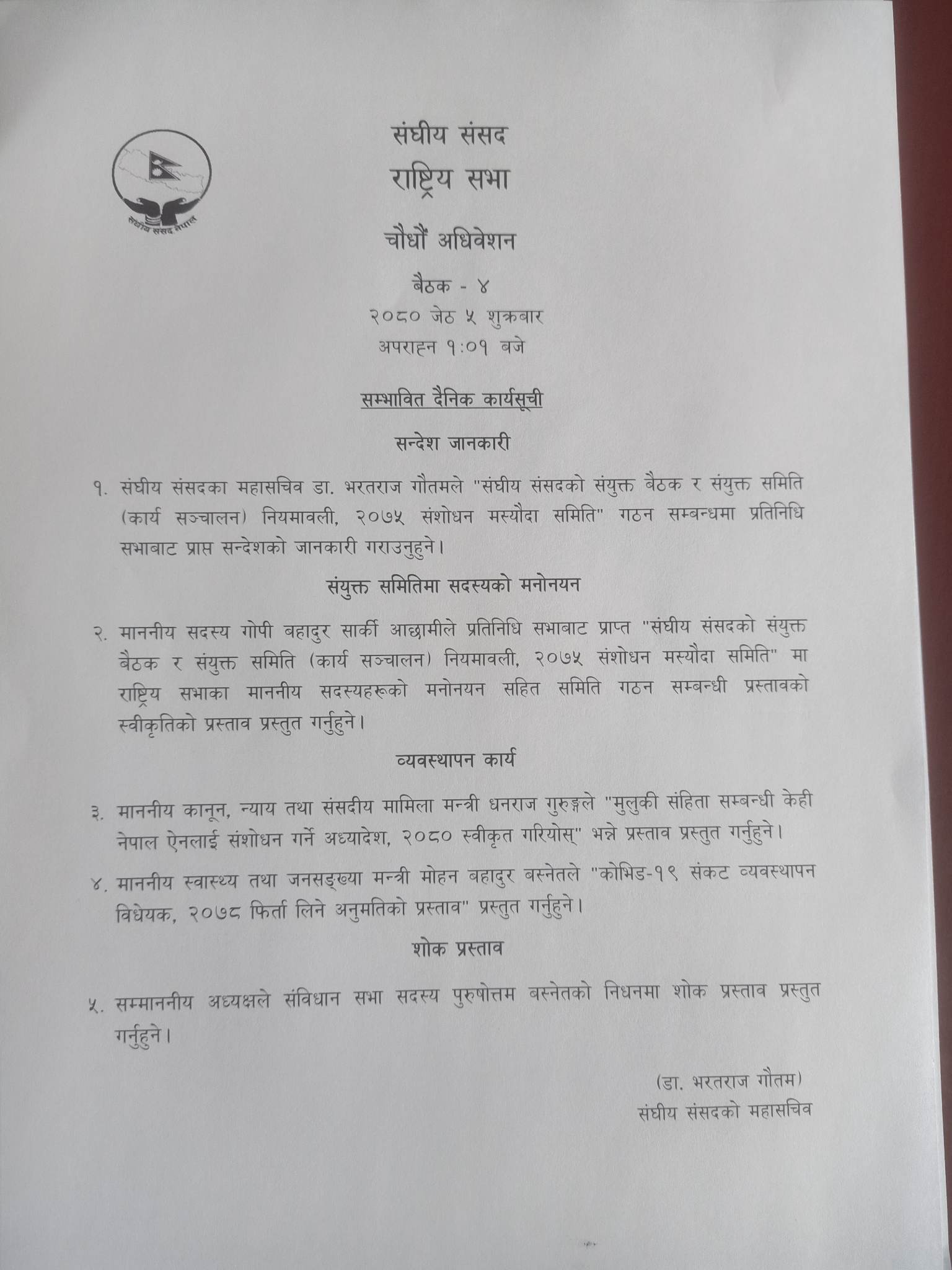 संघीय संसद सचिवालयले सार्वजनिक गरेको सम्भावित कार्यसुची अनुसार ‘संघीय संसदको संयुक्त बैठक र संयुक्त समिति (कार्य सञ्चालन) नियमावली-२०७५ संसोधन मस्यौदा समितिमा राष्ट्रिय सभा सदस्यहरुको मनोनयनसहित समिति’ गठन सबन्धि प्रस्तावलाई गोपीबहादुर सार्की आछामीले प्रस्तुत गर्ने छन् ।