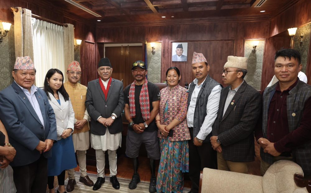काठमाडौं । प्रधानमन्त्री पुष्पकमल दाहाल ‘प्रचण्ड’ले दुवै खुट्टा गुमाएका कीर्तिमानी सगरमाथा आरोही हरिबहादुर बुढालाई सिंहदरवारमा भेटेर बधाई दिएका छन्।